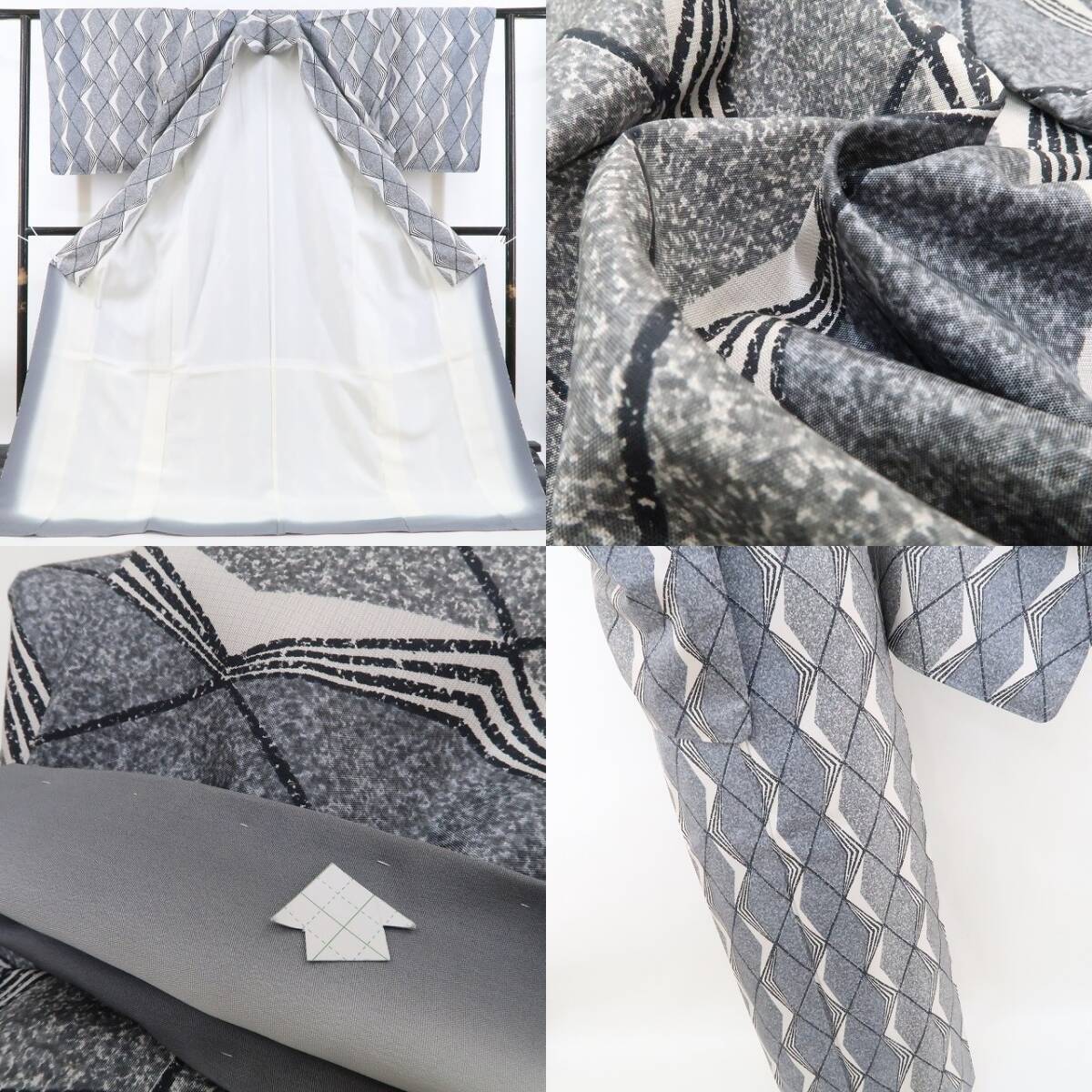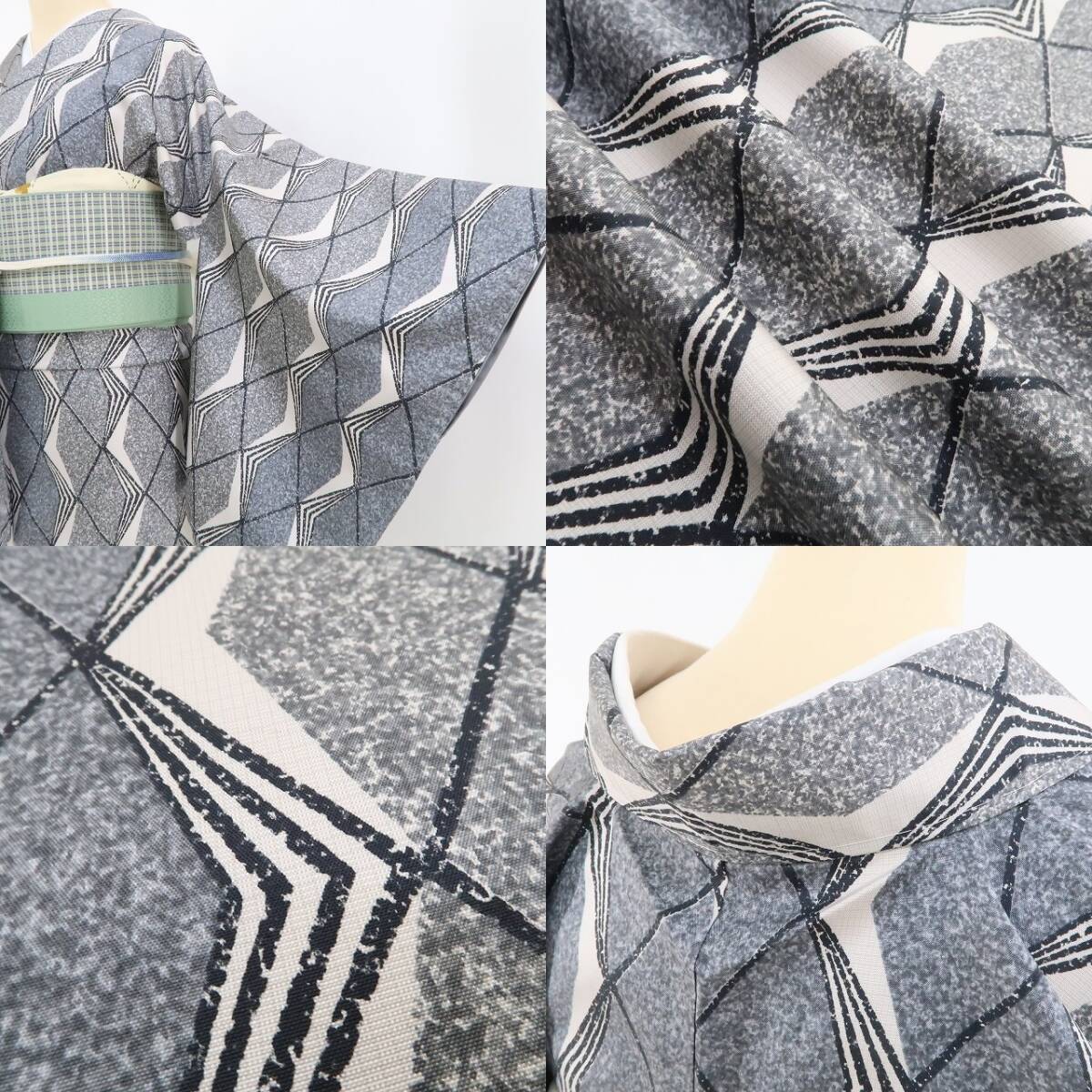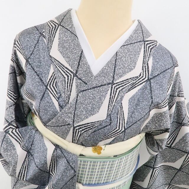 落ち着いたグレーの色地全面に描き込まれた菱格子の繋ぎ柄、シンメトリーな幾何学模様が創り出す不思議な視覚のインパクト、それはモダン小紋の粋な奥行…“和装を愛でるひと味違う大人の選択”、この一枚で叶う装いの楽しみとともに上質な着心地を存分にお楽しみください。