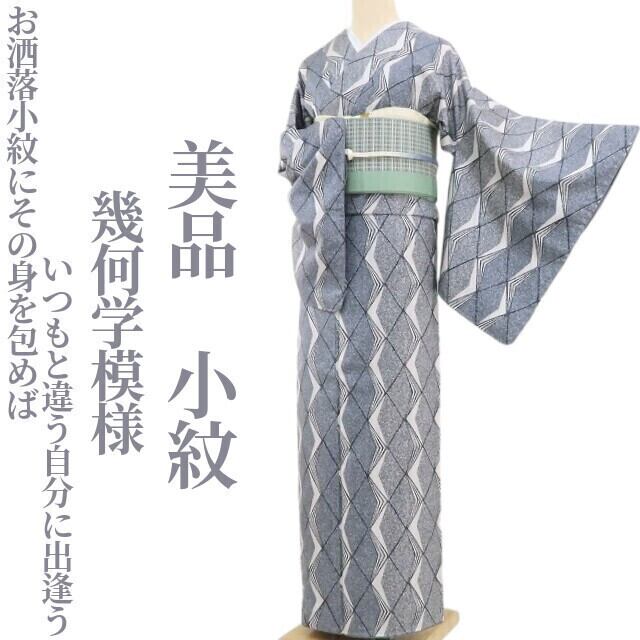 美品 幾何学模様 着物“お洒落小紋にその身を包めばいつもと違う自分に出逢う”正絹 仕付け糸付 小紋 4608