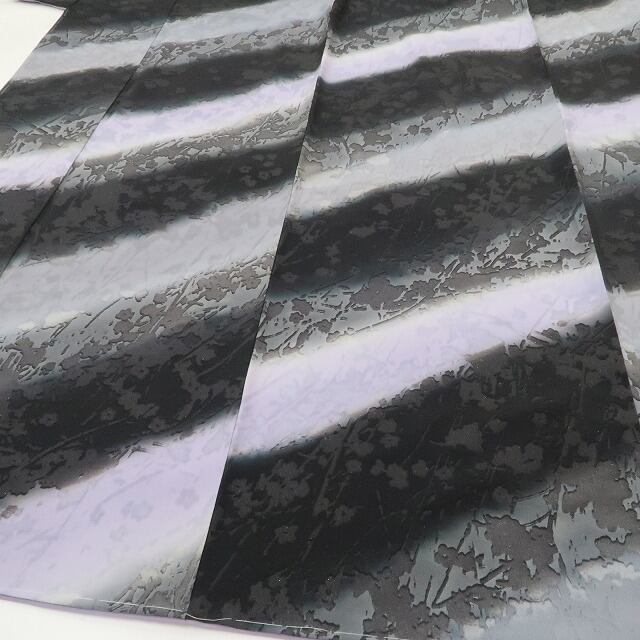 趣あるグレーと藤紫の濃淡に巧みな構図で鮮烈な陰影を映すアブストラクトなモダンデザイン、それは染色作家“山本唯与志”が描く現代絵画のような美しさ、豊かな感性に秘められた艶めいた和の奥行、貴女の装いを気品の趣で演出してくれるハイグレードなひと品。