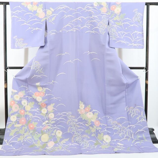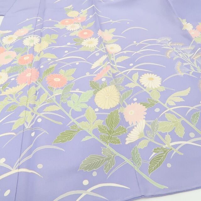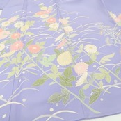 紅掛空色の柔らかな色地に描き込まれた花と和柄の組み模様、それは金通しの重厚感に慎ましやかに色を挿す露草と可憐な野花の艶景色、作家物ならではの丁寧な柄付けが印象的に際立つひと品…左右バランスのとれた柄行きが着物に落ち着きを与え、大人びた着物の華がものの見事に表現されています。
