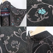 大人びた艶を放つ黒と浅紫色の彩色、彩り全面に流線を描くモダンな小花のデザインモチーフ、愛らしい兎のシルエットが醸し出すこの上ないお洒落感、それは想屋工房が創り出す洗練の風、正にモダン創作の王道を行くひと品…お召独特のしっとりとした風合いが着物の味わいを一段と深みある趣に変えています。