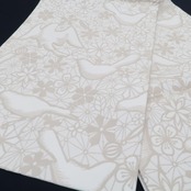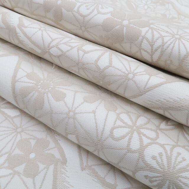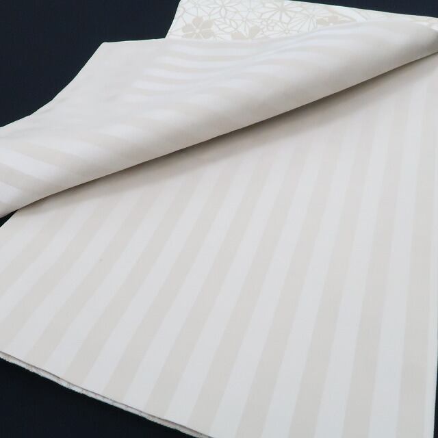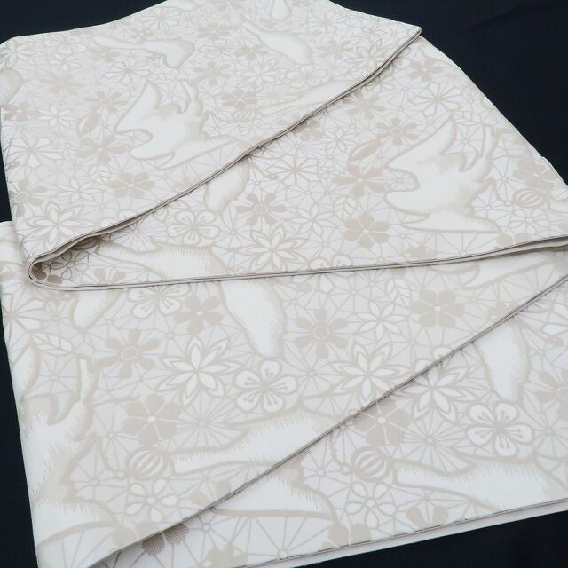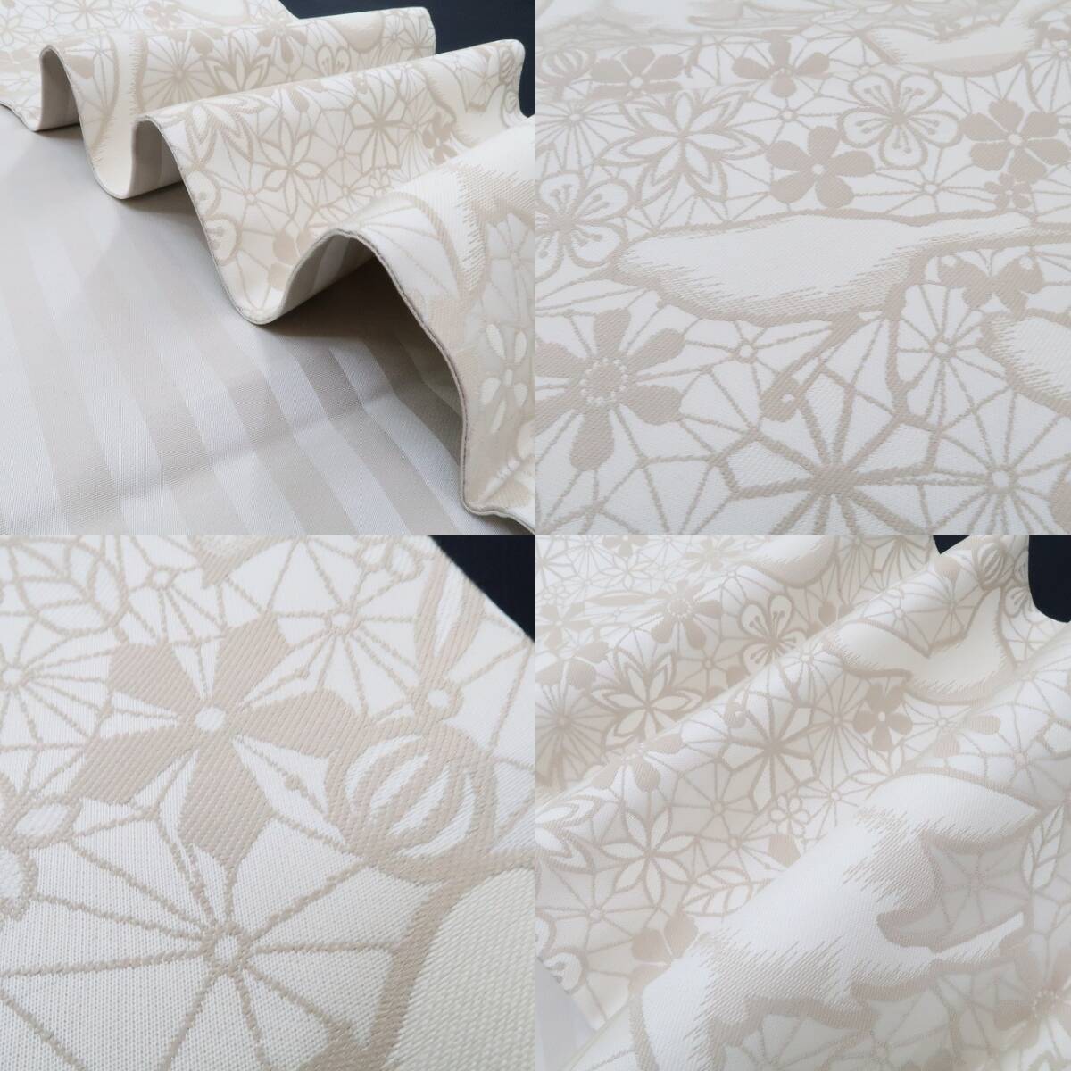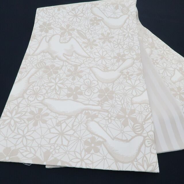 時々麻の葉を覗かせ乍ら上品な練色で優しく開かれる幸せの網には、羽ばたき、羽を休める鳥が止まり、その網に惹きつけられた桜や菊、梅や蝶を弾ませ、品よく華やかな時を奏で、裏面には粋な縞を広げる、撫松庵 正絹“全通”京袋帯でございます。