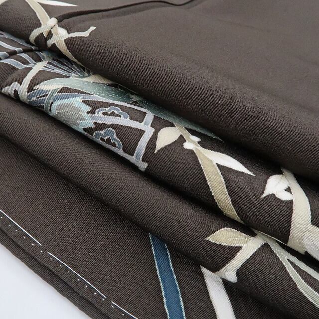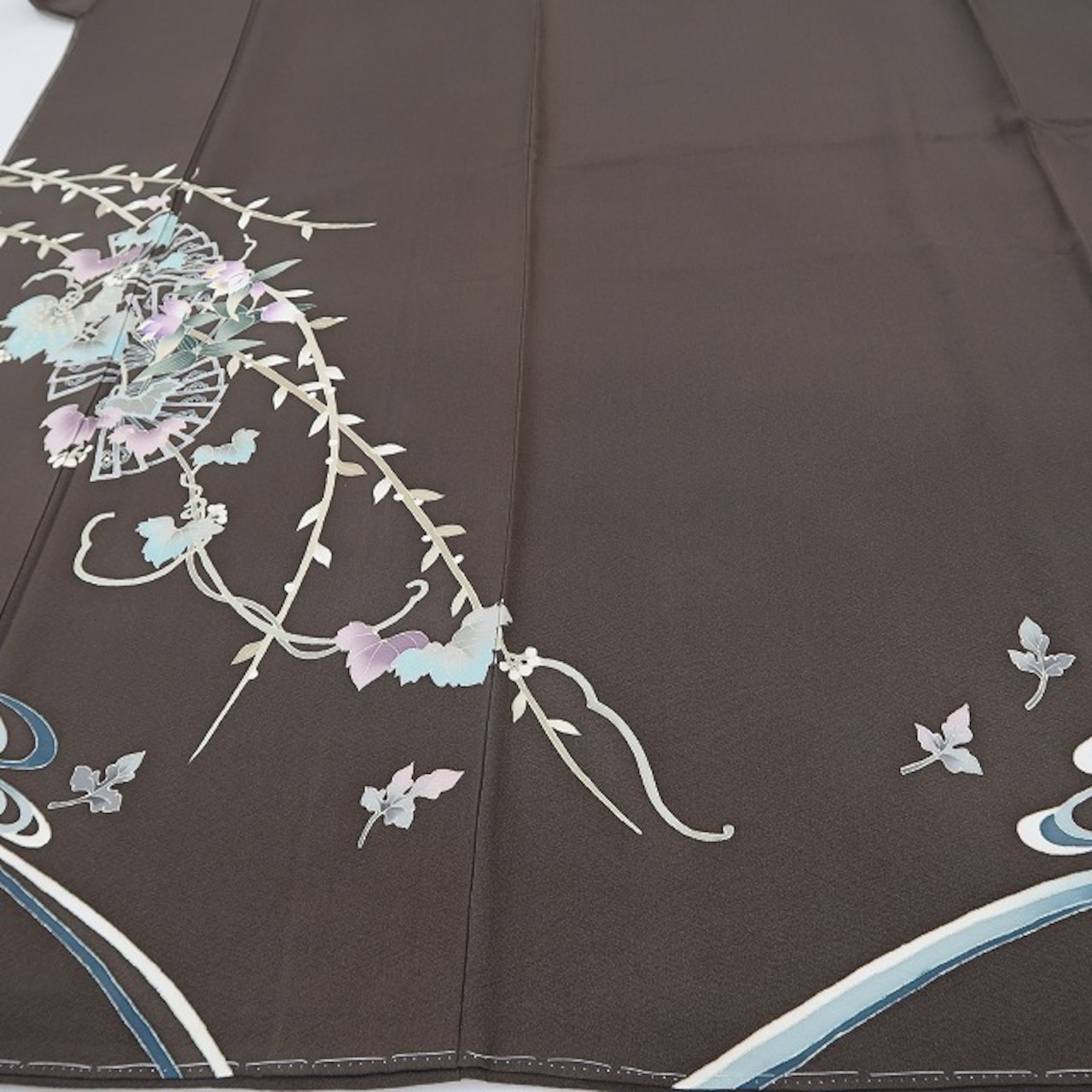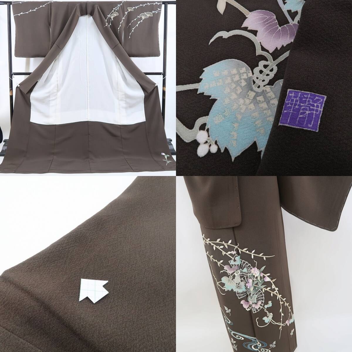 大地のように堂々と構え、優しい眼差しで見守る涅色を舞台に舞い踊る蔦や扇、麗しい花は、暖かな光を受けて美しさを増し、勢いある風や水を味方にこれから開花する楽しみも連れて袖を通す貴女が行く先々を彩る、本加賀友禅「橋本静香」落款 正絹 仕付け糸付訪問着でございます。