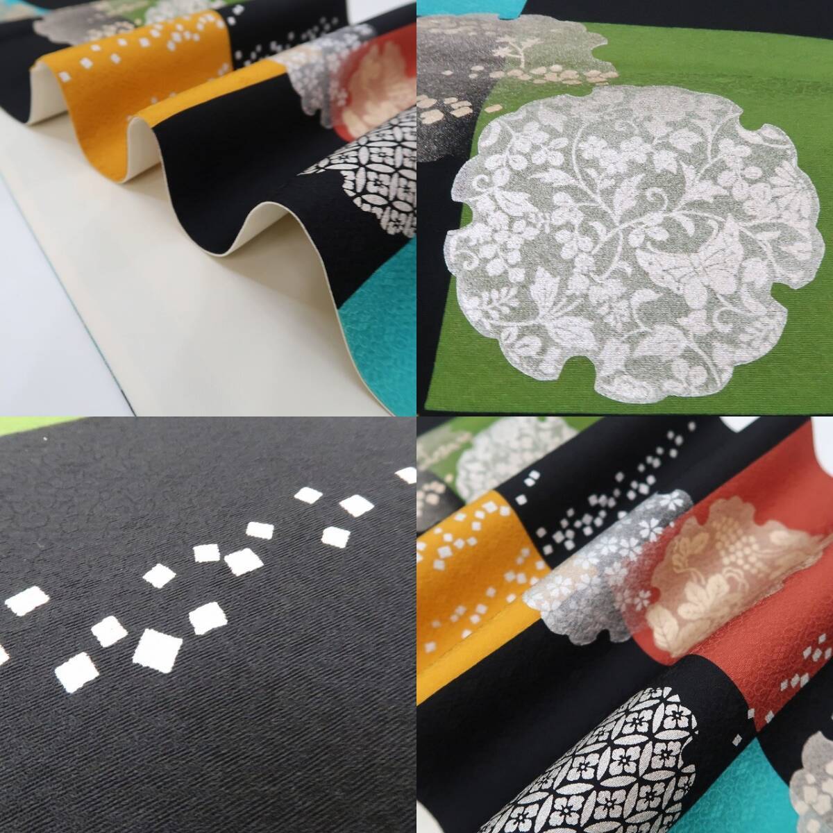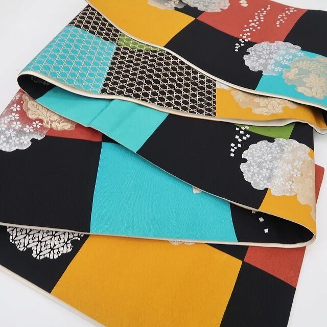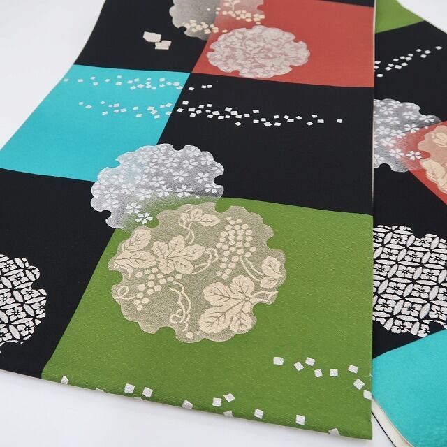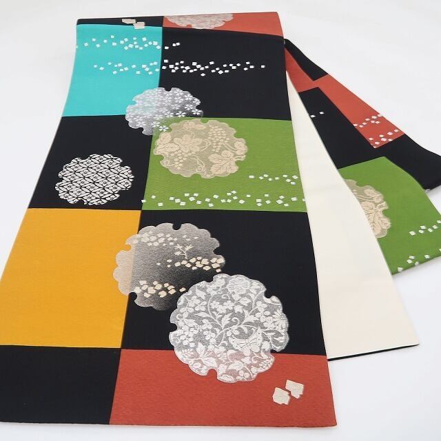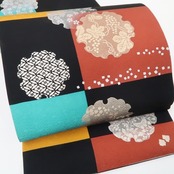黒を基調に多彩ながら丸みある色糸で織り出された市松格子の洒落模様、巧みな構図にデザイン雪輪が添える極上の艶、正にモダン創作の王道を行くひと品…優雅で気品あるその意匠性はお気に入りとなること間違いなし。
