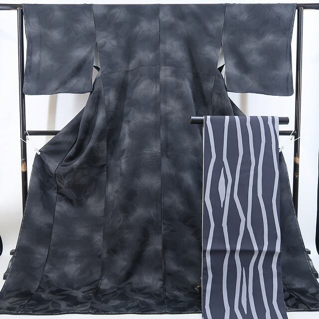 《着物》 シックな黒の色地に広がる大人色の落ち着き、濃淡状に浮かび上がるアブストラクトなモダンデザイン、それは巧みなアプローチで描き込まれた創作着物の研ぎ澄まされた感性、ダイレクトに意匠の力強さを感じさせてくれる一枚、不思議な空間に揺らぐ独創が溢れんばかりに魅惑の表情を魅せています。