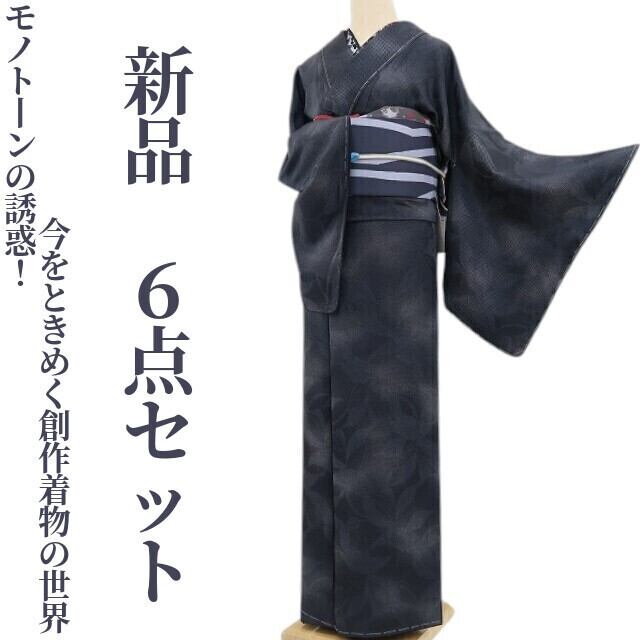 新品 6点セット 着物“モノトーンの誘惑!今をときめく創作着物の世界”仕付け糸付 小紋・袋帯・帯揚げ・半衿4727