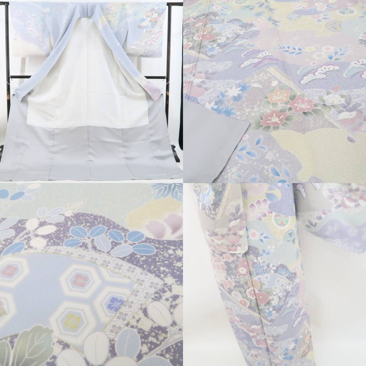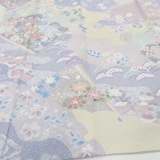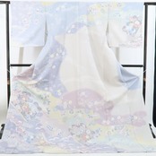 淡藤色・素色・浅紫色等の優しい色が春を思わせ、迫力を打ちながら歓びと古典美を解く松や橘、菊や梅、桜や椿、紅葉や桐、観世水、亀甲や七宝、冊子や扇が一斉に華やぐ情景は、目にするだけで心満たされると共に高鳴りが生まれ、日常を抜け出す慶びの場所へと背中を押す、正絹 仕付け糸付 トールサイズ訪問着でございます。