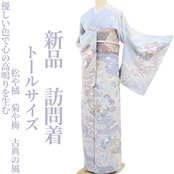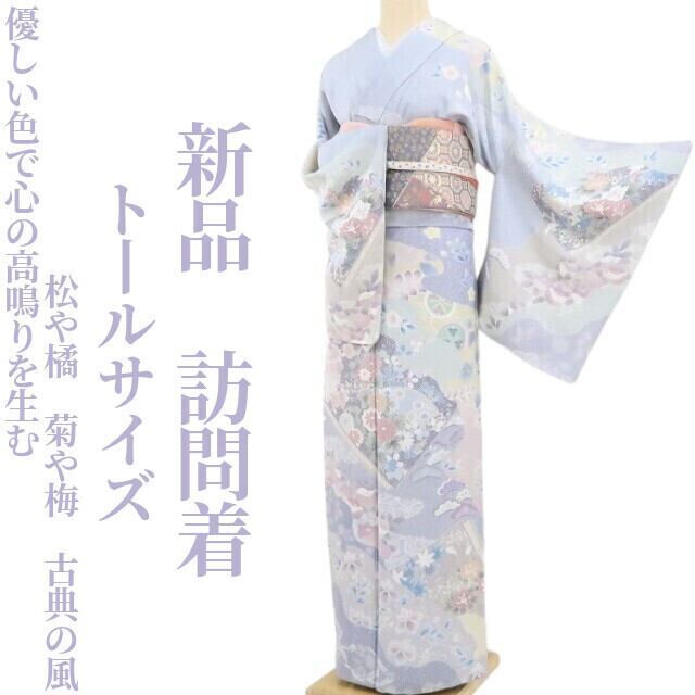 新品 着物 正絹 仕付け糸付 トールサイズ“春を思わせる優しい色で心の高鳴りを生む松や橘、菊や梅、古典の風”訪問着 4733