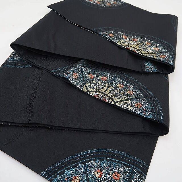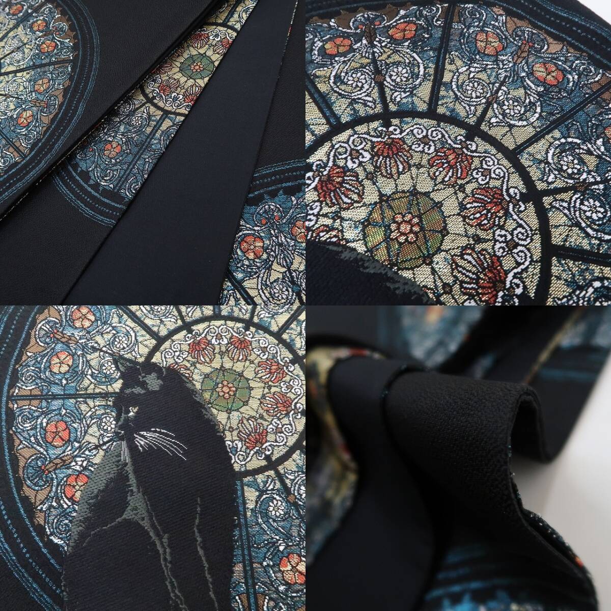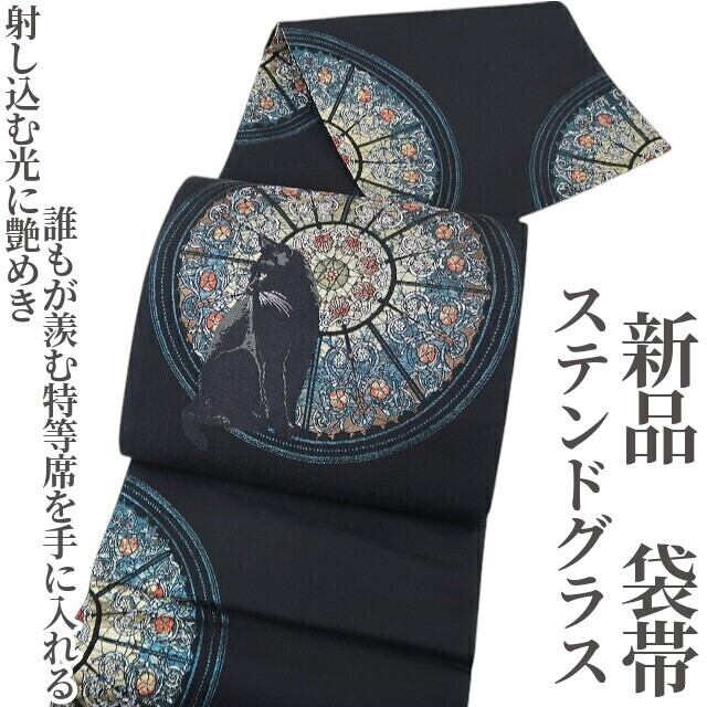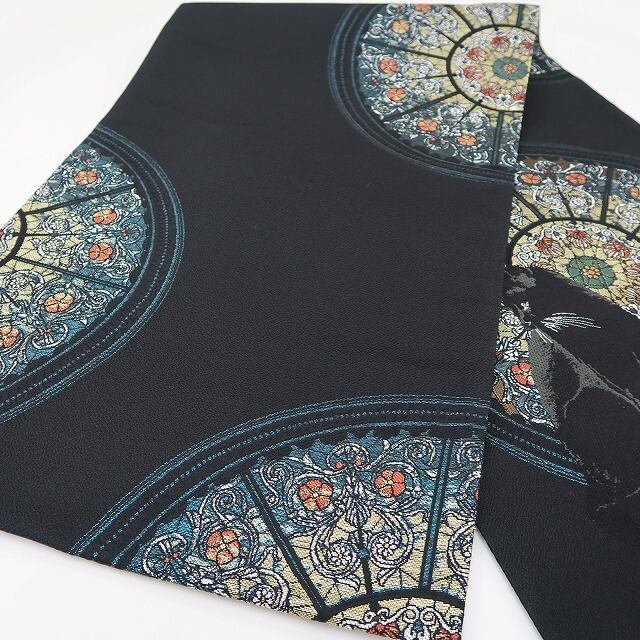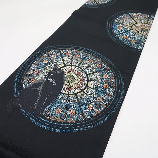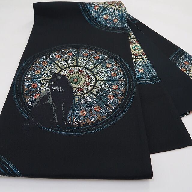 何色にも染まらない黒が広げる帳に幻想的な光と影を生み出し、芸術美を花開くステンドグラスが構え、その美しさに惹かれたのかクールな黒猫がちょこんとお座り、射し込む光に艶めき、そっと撫でたくなる毛並みを際立たせ、誰もが羨む特等席を手に入れる、黒猫“ステンドグラス”正絹袋帯でございます。