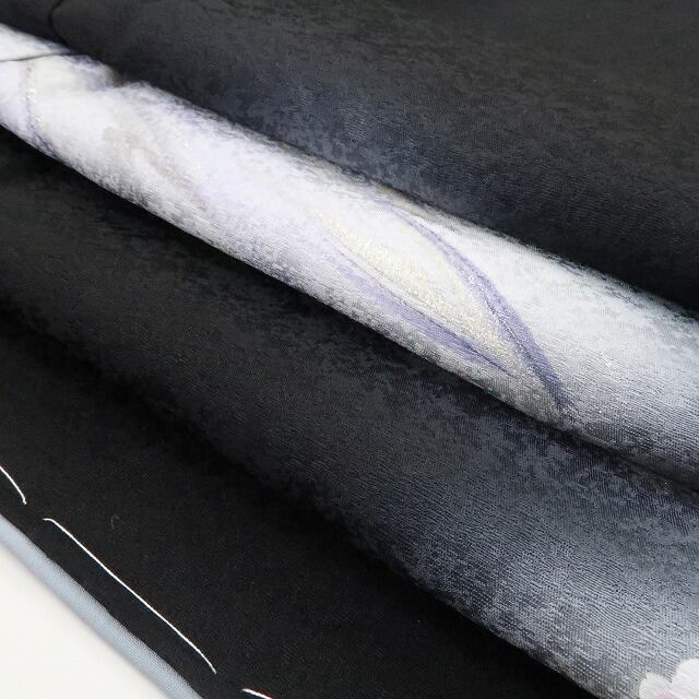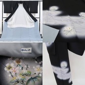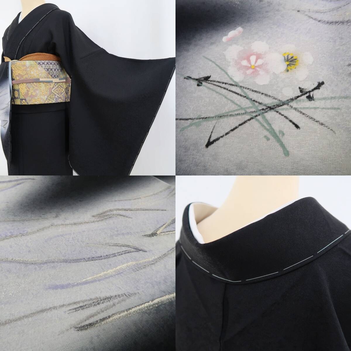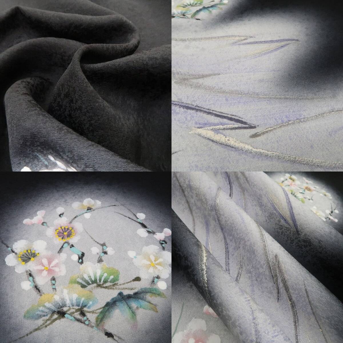 深みある黒の色地に艶めいて浮かび上がる趣豊かな吉祥景色、それは花寄せの松竹梅が醸し出す今をときめくモダンな色艶、日本人の感性が創り出す創作着物の世界観、素敵です。