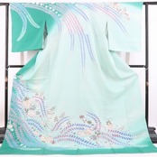 淡く朧げな夢のような色付きで優雅に枝垂れ、揺らめき、水しぶきでなく同じく夢のように色づいた桜や紅葉、菊や桔梗の草花が銀色の巧みな輝きと共にきっと此処だけの夢のような波打ちを魅せ、日常を抜け出し素敵な非日常へと誘う、辻ヶ花作家物落款“銀通し”正絹仕付け糸付訪問着でございます。
