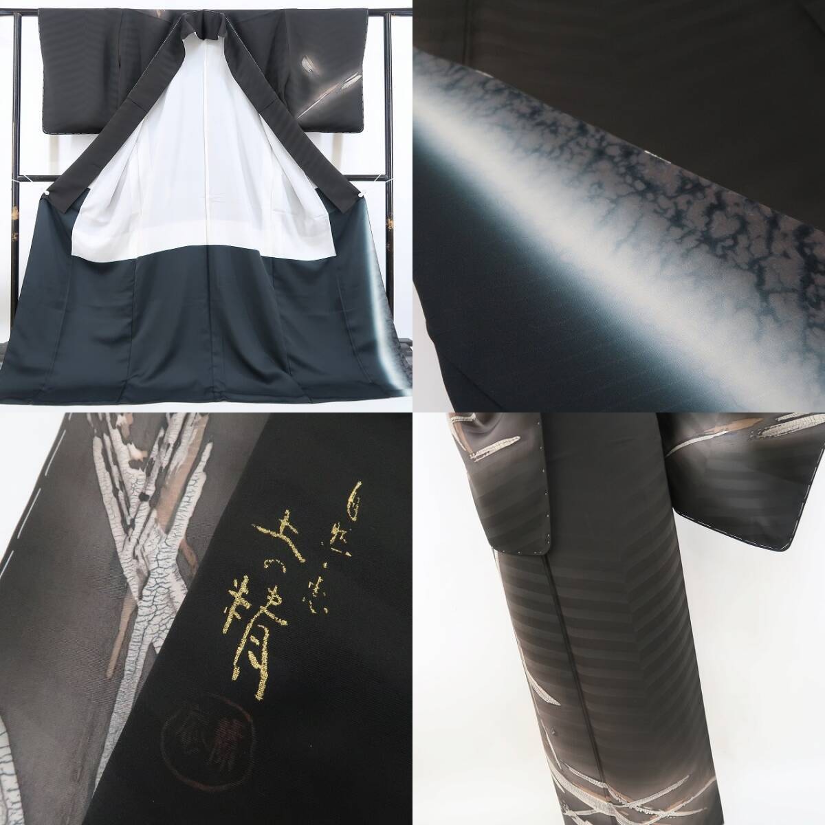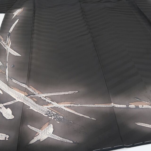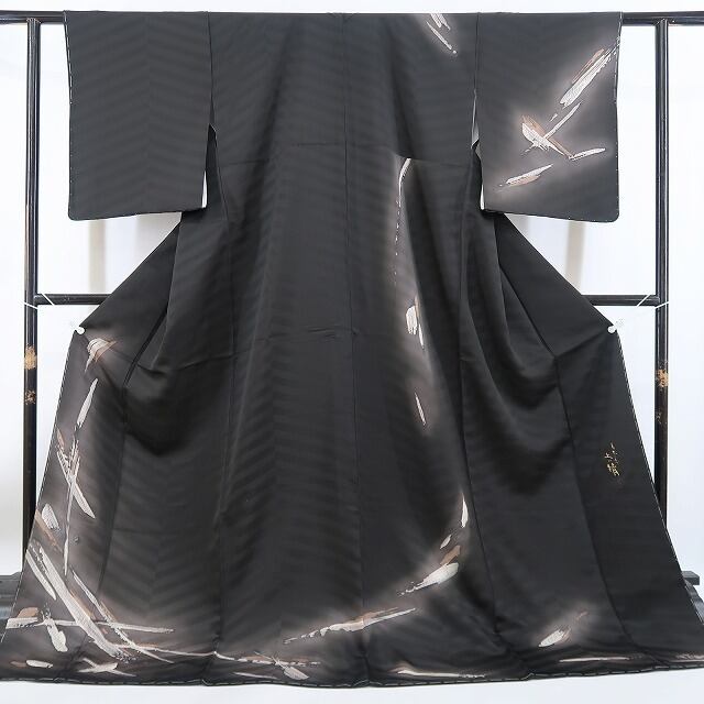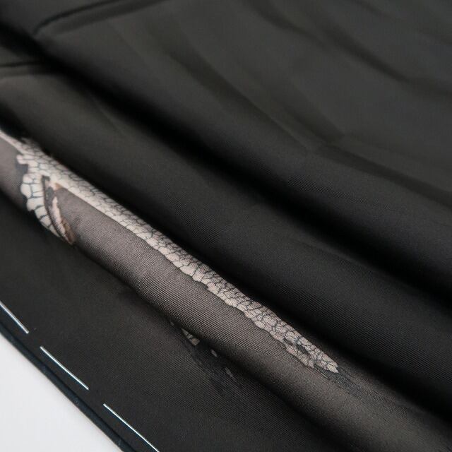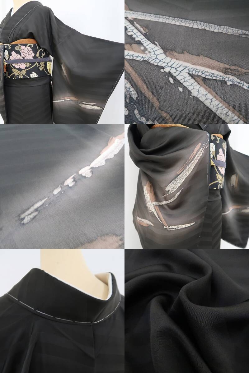 こちらのお着物は、ダークグレイッシュトーンの彩色で構図の美しさを意識したシンプルモダンな抽象柄を込めております。意匠が放つ不思議な視覚のインパクト、思わず引き込まれるその完成度は必見!