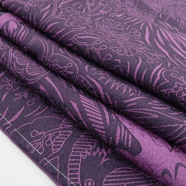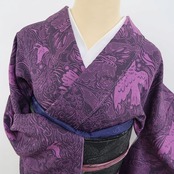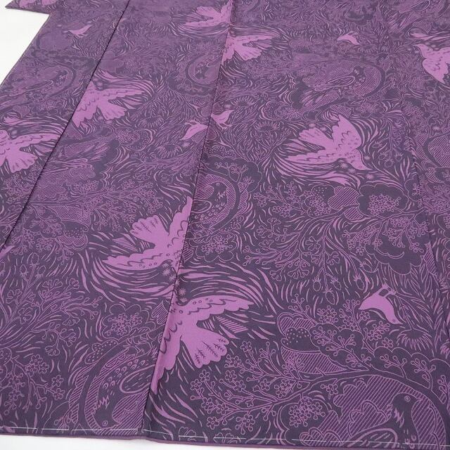 奥行を放つ葡萄色の地に広がる大人びた表情、全面に謎めいた揺らぎを魅せる花の流線、そして鮮烈なインパクトを残す三才着物の象徴“飛翔鳥”、彩りの濃淡や地紋をデザイン化するなど視覚を捉える拘りが随所に込められたひと品、正に“三才調”と呼ばれるに相応しいい斬新さが魅力です。