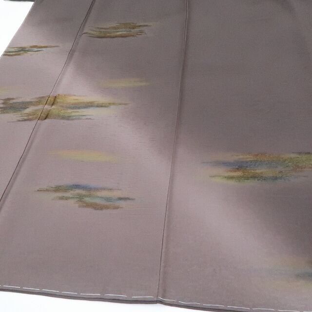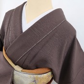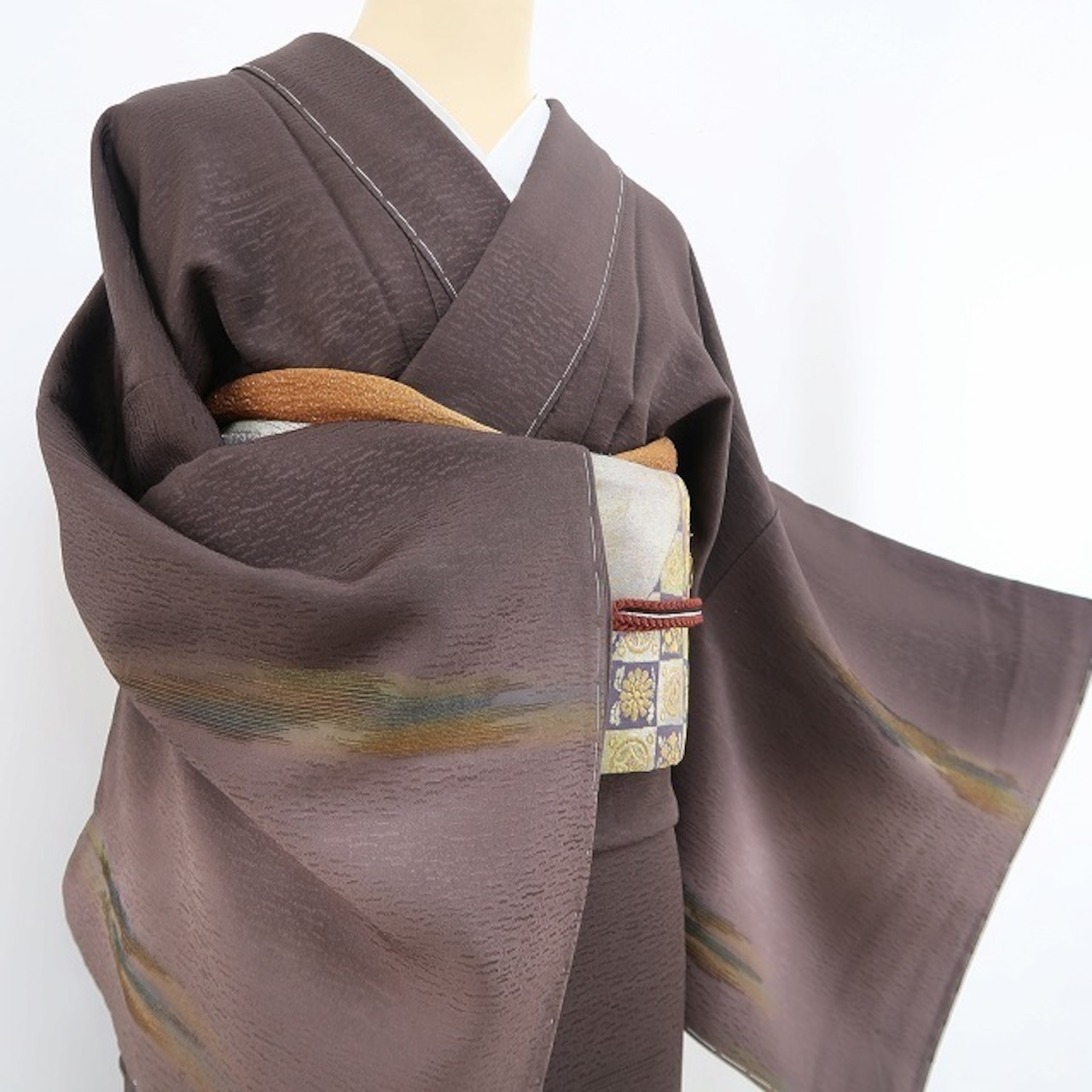 大人びた表情で彩色された海松茶色の濃淡、柔らかなグラデーションに和を刻む豊かな地柄の美しさ、そして慎ましくも鮮烈なインパクトを残す抽象柄のデザインモチーフ、ダイレクトに大人のセンスを感じさせてくれるひと品…ほのかな色香に染まりながら貴女へ上質の高揚感を届けてくれます。