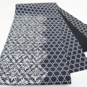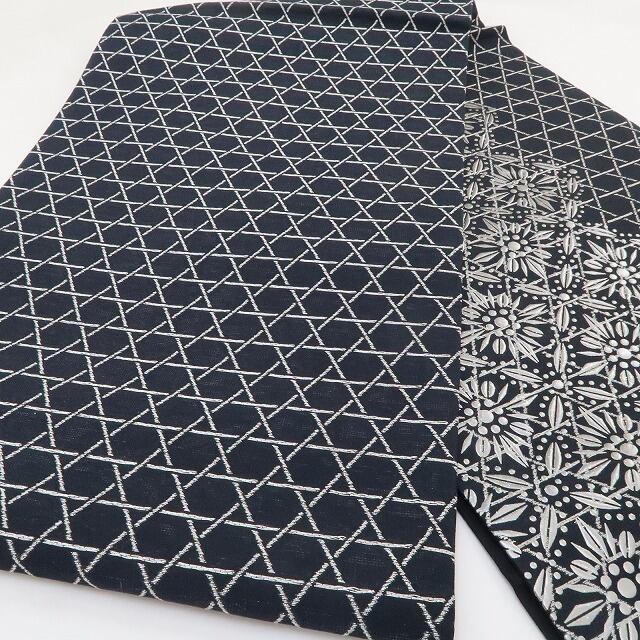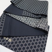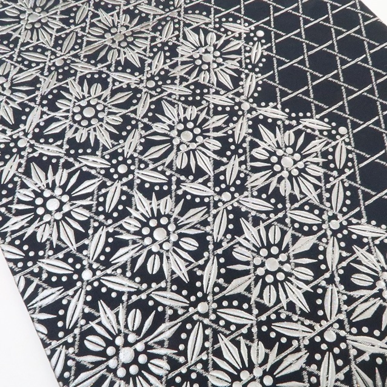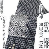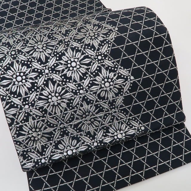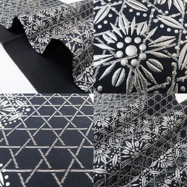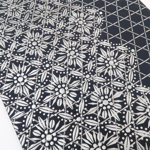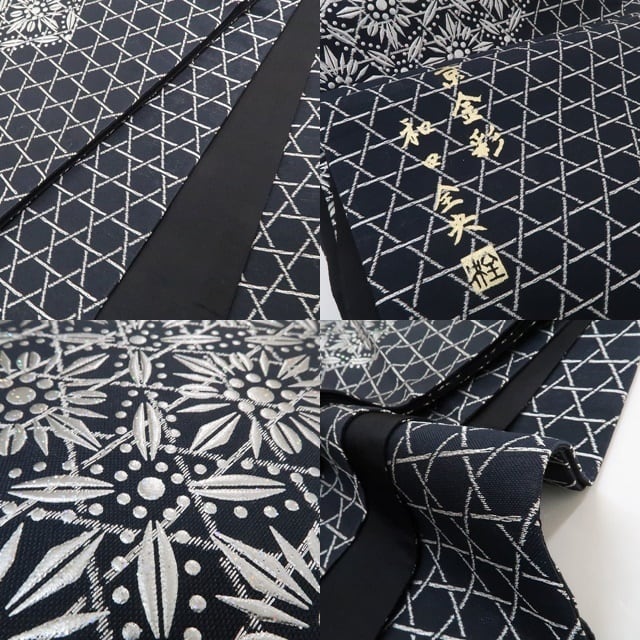 シックな黒とシルバーの帯地に広がる上品な艶、コントラストに浮かび上がる籠目と創作華文の組み模様、そして一閃に鮮烈なインパクトを残す金彩箔の光、それは正に金彩友禅の技法が創り出す刺繍のような立体感、彩色の妙に独特の感性が描き出す“美の世界”が極彩の美しさを醸しています。