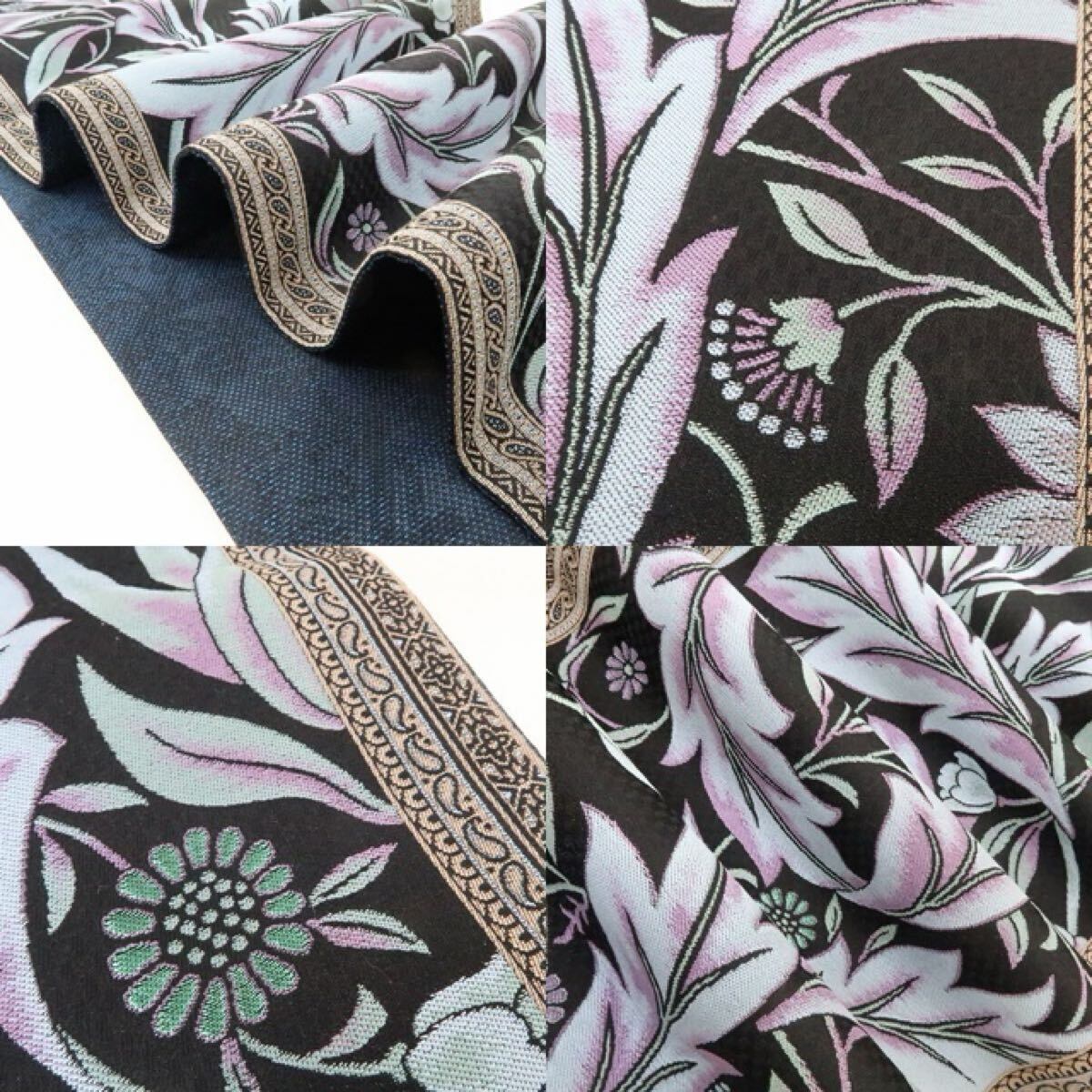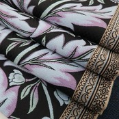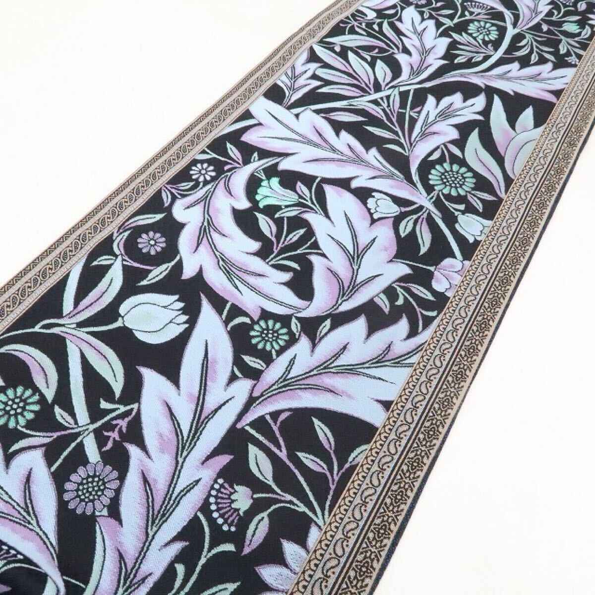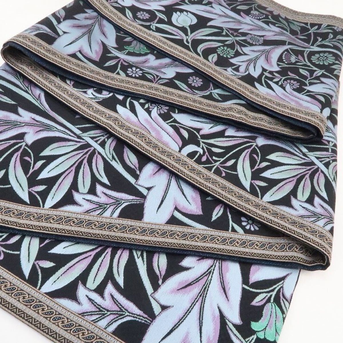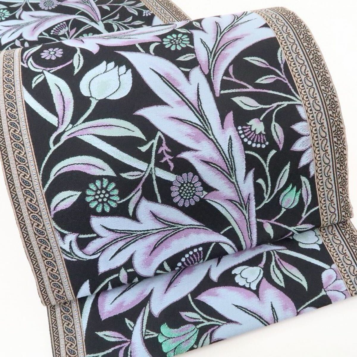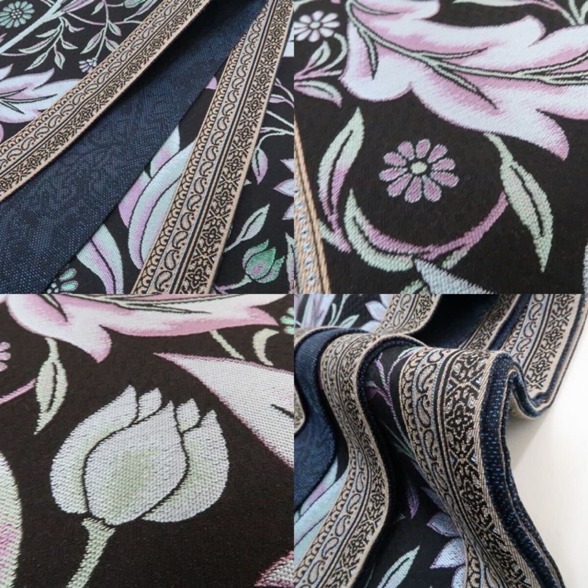 丸みある黒を基調に多彩ながら落ち着いた色味で織り出された艶めいた花葉のデザインモチーフ、まるでモダン絵画のように煌くその表情は必見!大人の貴女へ贈る“取って置き”のひと品…意匠に醸し出されるモダンな色艶に心憎い和のテイストが落とし込まれています。