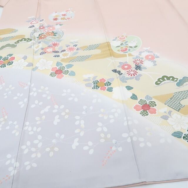 こちらのお着物は、柔らかなトーンの彩色で染めの美しさにフォーカスした日本古来の吉祥景色を込めております。楚々として飾り過ぎず、お正月の装いやお祝いの席に最適なお召し物です。