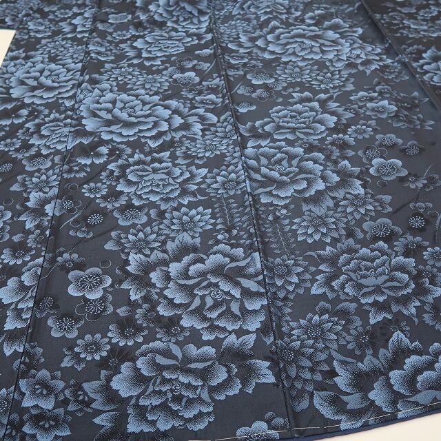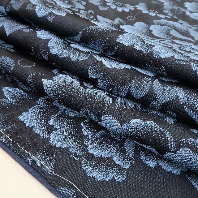 濃藍色の濃淡に広がるこの上ない大人びた表情、全面に艶めいて浮かび上がる牡丹の花、それは正に“大人を振りほどく花の眼差し”、柄行を微細なコントラストでシンプルモダンに表現したひと品、お召独特のしっとりとした風合いが着物の味わいを一段と馴染みやすい趣に変えています。