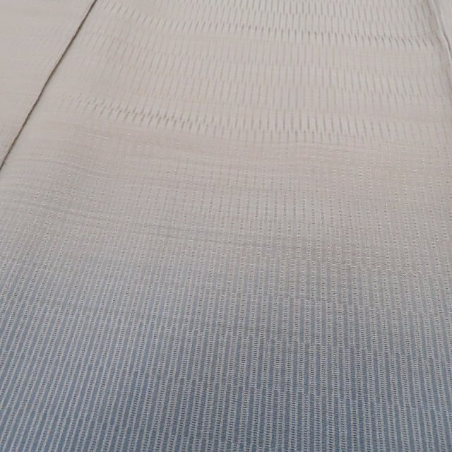 お召は、お召縮緬(おめしちりめん)を省略したもの。織りの着物地の中でも最も高級とされ、光沢と上質なシャリ感が特徴。経糸(たていと)と緯糸(よこいと)に、糸にねじりを加えた撚糸(ねんし)を使い、生地の表面に細かい「シボ」があるため縮緬の名前がついています。お召は紬や木綿と同じ織りの着物ですが、他の縮緬よりもコシが強くシワになりにくいという特性を持ち、着崩れしにくく裾さばきがよいため洒落着に向くとされています。また、生地として織る前に糸を染め、その色糸で生地の色や模様を生み出す先染めの着物で、柄ものには織り生地の凹凸により微妙な陰影の奥行き感があります。