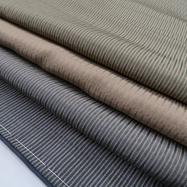 趣ある藍松海茶色・榛(はしばみ)色・黄海松茶色の柔らかな濃淡に広がるこの上ない大人びた艶、横段状の構図に色を挿すその表情は正に“大人を標す夢の後先”、意匠に醸し出されるえも言われぬお洒落感は必見の価値あり!それは類稀なる感性が創り出す曽根武勇の世界観そのもの、意匠を微細なコントラストでシンプルにアレンジしたひと品、お召独特のしっとりとした風合いが着物の味わいを一段と馴染みやすい趣に変えています。