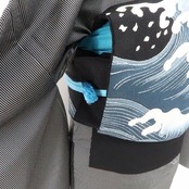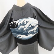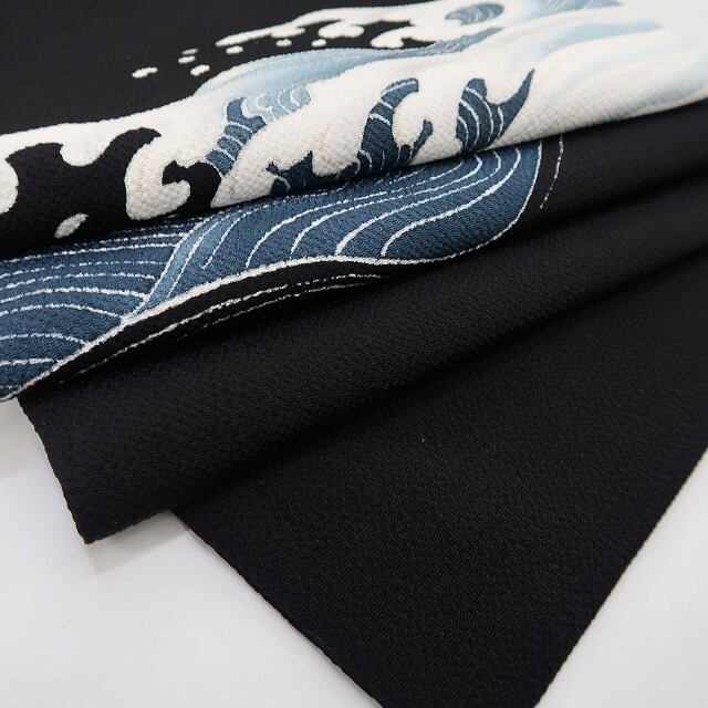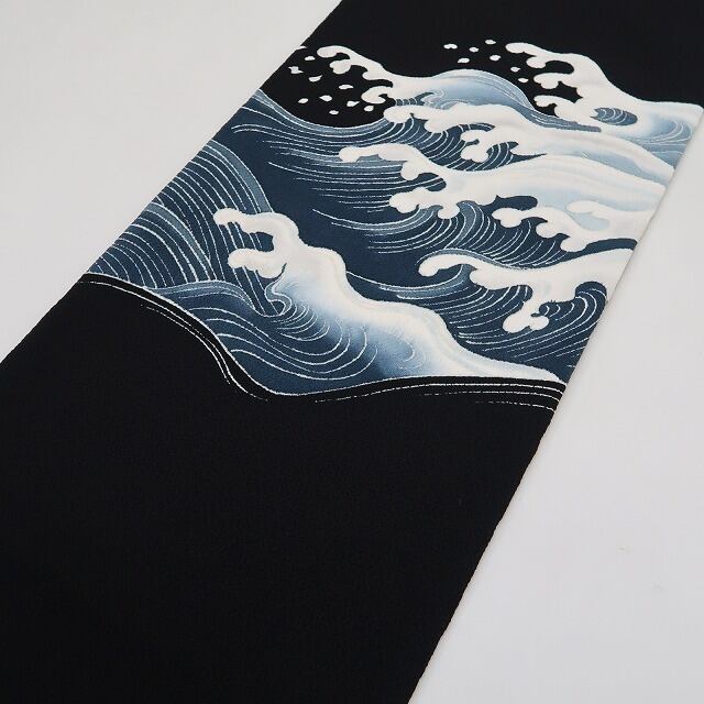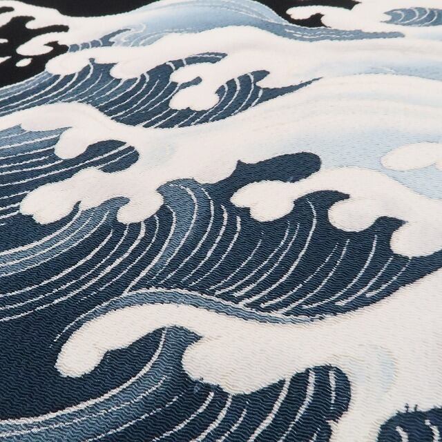 黒が打つ静寂に力強く立ち昇り、水しぶきを散らして美しい躍動を打つ波は、深い色から光を手にした色付きで今にも帯を飛び出しそうな勢いで眠りについた時に明かりを点け、まるで素敵な場所へと先導するようかのような結びを披露する、白木染匠 白木周生 お仕立て上がり品 正絹なごや帯でございます。