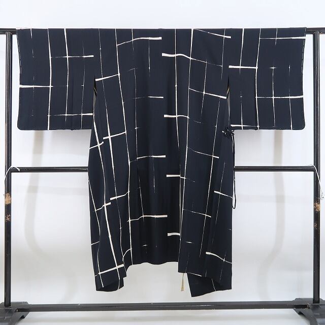 その静かな美に近づくと、一面に縦縞を広げてシンプルながらも際立つ格子が見せる味のある伸びに時々擦れる表情がさり気なく雰囲気を引き立てセンスを物語る、“モノトーン”正絹 仕付け糸付 ロング丈道中着でございます。